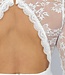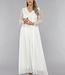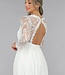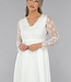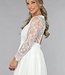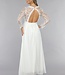 Dieses Kleid ist aus einem Spitzenstoff in Kombination mit einem Chiffonstoff gefertigt. Das Mieder des Kleides ist aus Spitze gefertigt und hat lange durchsichtige Ärmel. Es hat einen schönen tiefen V-Ausschnitt und einen taillierten Bund. Der Rock des Kleides ist ausgestellt und aus einem Chiffon-Stoff mit einem schlichten weißen Innenrock gefertigt. Was dem Kleid ein besonderes Aussehen verleiht, ist der offene Rücken. Er ist ganz aus Spitze gefertigt und kann am Hals mit einem Knopf geschlossen werden. Unten am Rücken hat das Kleid einen verdeckten Reißverschluss, so dass man es leicht an- und ausziehen kann.