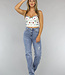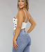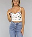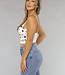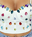 Dieses Bustier-Top ist auf der Vorderseite mit bunten Nieten verziert. Es hat verstellbare Spaghetti-Träger und einen Fünf-Haken-Verschluss am Rücken, der in vier Positionen verstellbar ist. Die Körbchen des Bustiers sind mit Bügeln versehen und sorgen für einen guten Sitz.