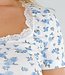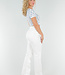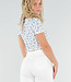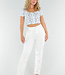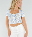 Dieses weiße Crop-Top ist aus einem gerippten Material mit Stretch gefertigt. Das Top hat eine kurze Passform, kurze Ärmel und einen quadratischen Ausschnitt. Entlang des Ausschnitts befindet sich eine weiße Spitzenborte, die am Ende gesäumt ist. Das Oberteil wird vorne mit kleinen weißen Knöpfen geschlossen.