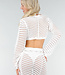 Dieses Cover-up-Set besteht aus zwei Teilen und ist zum Tragen über Badebekleidung gedacht. Das Set ist aus weißem, gehäkeltem Material mit einer offenen Struktur gefertigt. Das Oberteil hat lange Ärmel, einen Rundhalsausschnitt und endet oberhalb der Taille. Der dazu passende Rock hat eine figurbetonte Passform und eine hohe Taille.
