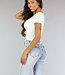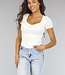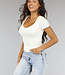 Dieses Oberteil aus Stretch-Stoff hat einen weiten Ausschnitt und kurze Ärmel. Das Oberteil ist dehnbar und hat ein plissiertes Detail an der Seite. Außerdem ist das Oberteil unifarben, wodurch es leicht zu kombinieren ist.