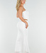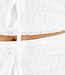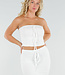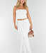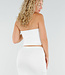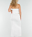 Dieses weiße 2-teilige Set besteht aus einem Bandeau-Top und einem langen, verbundenen Rock. Das Set ist aus einem dehnbaren, strukturierten Stoff mit einem leicht geprägten Muster gefertigt. Das trägerlose Oberteil hat eine Schnürung auf der Vorderseite und einen Gummizug am oberen Rand für zusätzlichen Halt. Beide Teile sind aus einem leichten, gefütterten Stoff mit sichtbarer Textur.