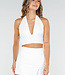 Dieses Neckholder-Top ist weiß und hat einen tiefen V-Ausschnitt auf der Vorderseite. Es ist tailliert geschnitten und hat einen Träger im Nacken. Der Stoff ist glatt und sehr dehnbar, so dass es eng anliegt. Der Rücken ist tief ausgeschnitten und ganz schlicht. Das Top fällt am Oberkörper kurz aus.