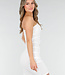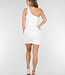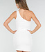 Dieses Kleid ist aus weißem Material mit einer subtilen Struktur und einer figurbetonten Passform gefertigt. Das Design hat einen One-Shoulder-Ausschnitt mit einem breiten Schulterträger. Das Kleid ist kurz geschnitten und mit horizontalen Falten versehen, die sich gleichmäßig über die Vorderseite ziehen. Das Material enthält Stretch, wodurch sich das Kleid dem Körper anpasst und geschmeidig mitbewegt.