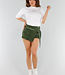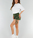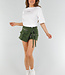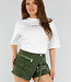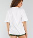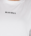 Dieses weiße T-Shirt hat eine übergroße Passform und fällt locker um den Körper. Das Shirt hat einen Rundhalsausschnitt und halblange, kurze Ärmel, die etwas weiter ausgestellt sind. Ein kleiner schwarzer Aufdruck mit dem Wort "MINIMAL" in der Mitte der Brust sorgt für einen subtilen, minimalistischen Look. Der Stoff ist aus Baumwolle und hat einen Stretch-Anteil. Der Saum fällt gerade und auf Hüftlänge.