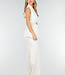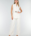 Dieses weiße Set besteht aus einem ärmellosen Oberteil und einer passenden Hose mit weitem Bein. An der Taille befindet sich ein brauner Gürtel mit einer großen goldfarbenen Schnalle in Form einer organischen Blume. An beiden Seiten befinden sich kleine Klappendetails. Die Hose hat einen hohen, glatten Bund und gerade, weite Hosenbeine.