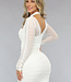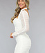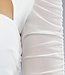 Dieses super dehnbare Kleid hat lange transparente Ärmel. Das Kleid ist aus einer Art Mesh-Stoff gefertigt und hat ein doppeltes Futter am Mieder, um Durchsichtigkeit zu verhindern. Das Kleid hat einen Ausschnitt am Halsausschnitt, der mit zwei Knöpfen geschlossen werden kann. Das Kleid ist in schöne Falten gelegt und hat einen verdeckten Reißverschluss am Rücken. Das Kleid fällt oberhalb des Knies.