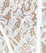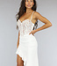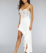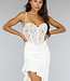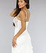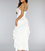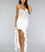 Der Rock des Kleides ist aus einem dehnbaren Stoff gefertigt und fällt in schönen Falten, mit Rüschen für einen besonders verspielten Effekt. Das Oberteil ist einfarbig nackt und hat einen weißen Spitzenüberzug, der einen schönen Kontrast bildet. Das Kleid hat Spaghettiträger und ist mit einem Gummizug versehen, wodurch es bequem und gut sitzend ist.