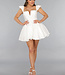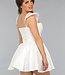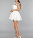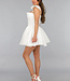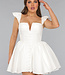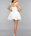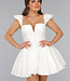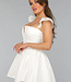 Dieses Kleid ist aus einem unifarbenen, festen Stoff gefertigt. Das Oberteil hat einen geraden Ausschnitt mit einem V-Detail. Das Kleid hat zwei kleine Rüschenärmel. Das Oberteil ist tailliert und hat einen Reißverschluss auf der Rückseite. Der Rock des Kleides hat einen Skater-Stil und ist weit geschnitten. Das Kleid hat keinen Stretchanteil.