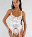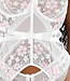 Dieses weiße Spitzen-Dessous-Set besteht aus einem leicht durchsichtigen Oberteil mit Blumenmuster. Der Stoff kombiniert feine Spitze mit Mesh-Einsätzen. Die Träger sind verstellbar und werden am Rücken mit einem Hakenverschluss geschlossen. An der Unterseite befinden sich vier abnehmbare Strumpfhalter mit Metallclips. Die Ränder sind mit elastischer Spitze für eine gute Passform versehen. Das Set wird komplett mit passenden weißen Strümpfen mit Spitzenrand geliefert.