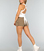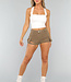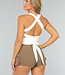 Dieses weiße Stretch-Sporttop hat einen quadratischen Ausschnitt und breite Schulterträger. Auf der Rückseite hat es gekreuzte Träger, die in einer Schleife enden. Das Top hat herausnehmbare weiche Pads, so dass das Tragen eines BHs nicht notwendig ist.