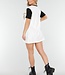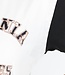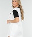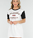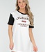 Dieses Kleid ist ein lässiges T-Shirt-Kleid in gerader Passform mit einer kurzen Länge, die über den Knien endet. Das Kleid ist überwiegend weiß mit kontrastierenden schwarzen kurzen Ärmeln und einem schwarzen Rundhalsausschnitt. Auf der Brust befindet sich ein auffälliger Druck mit den Worten "California" und "Los Angeles" in einer Kombination aus braunem Leopardenmuster und roten Akzenten. Der Stoff wirkt leicht und geschmeidig, ideal für legere Outfits. Es gibt keine sichtbaren Verschlüsse oder zusätzliche Details wie Taschen oder Gürtel.