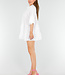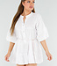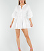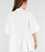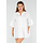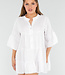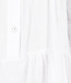 Dieses weiße Tunikakleid ist aus luftigem Baumwollstoff gefertigt und hat eine kurze, locker sitzende Passform. Das Kleid hat einen runden Stehkragen und einen vorderen Knopfverschluss mit drei Knöpfen. Die Dreiviertel-Ärmel sind mit breiten Rüschen abgeschlossen. Das Kleid besteht aus drei gerafften Streifen und fällt oberhalb des Knies. Das Material hat einen leichten Crinkle-Effekt.