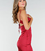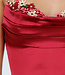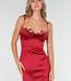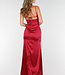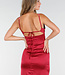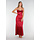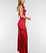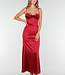 Dieses lange Kleid ist aus glänzendem Satin in einem tiefen Weinrot. Das Kleid ist eng geschnitten und fällt gerade bis zum Boden. Auf den Schulterträgern sind Blumen in Rosa, Gelb und Grün aufgestickt. Das Kleid ist ärmellos und hat einen offenen Rücken mit verstellbaren dünnen Trägern.