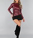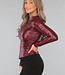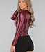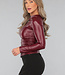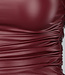Dieses Oberteil ist aus einem Stretch-Stoff mit einer Beschichtung aus veganem Leder gefertigt. Es hat einen hohen Halsausschnitt und lange, taillierte Ärmel. Sowohl an der Schulter als auch an der Taille hat das Oberteil ein plissiertes Detail, das ihm den letzten Schliff verleiht. Außerdem verfügt das Oberteil über einen verdeckten Reißverschluss in der Taille.