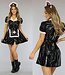 Dieses PVC-Kostüm hat kurze Ärmel mit rosa Details. Das Kleid hat kurze Puffärmel mit rosa Rüschen und einen rosa Kragen. Das Kleid lässt sich mit Knöpfen schließen. Zu diesem Kostüm gehört eine Schürze mit einem rosa Kreuz und den gleichen rosa Rüschen wie an den Ärmeln des Kleides sowie das Diadem. Mit diesem Kostüm werden Sie auf den kommenden Halloween-Partys bestimmt auffallen!