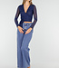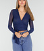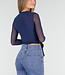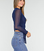 Diese blaue Mesh-Wickeljacke hat lange, halbtransparente Ärmel und einen eleganten Wickelausschnitt mit Schleifendetail an der Seite. Die Jacke ist leicht durchscheinend und kann als Top oder als dünne Jacke getragen werden. Das Material enthält Stretch, wodurch sie bequem sitzt und schön fällt.