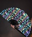 Dieser tolle Fächer ist perfekt für Indoor-Festivals! Das liegt daran, dass der Fächer grau aussieht, aber versuchen Sie, ein Blitzlichtfoto davon zu machen und Sie werden sehen, wie schön regenbogenholographisch reflektierend er ist! Der Fächer hat einen coolen Aufdruck, der bei Blitzlicht komplett aufleuchtet.