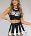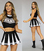 Das Oberteil ist ärmellos und hat einen Rundhalsausschnitt. Der Rock fällt schön weit und ist in Falten gelegt. Auf der Brust steht in schwarzen Buchstaben CHEERS. Die Rückseite des Oberteils ist einfarbig schwarz.