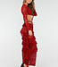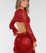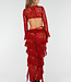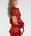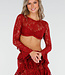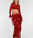 Dieses Set besteht aus einem halbtransparenten Oberteil und einem passenden Rock, beide komplett aus roter Spitze mit Blumenmuster. Das Crop-Top hat einen runden, gefütterten Ausschnitt, lange Ärmel mit leicht ausgestellten Enden und einen offenen Rücken. Der Rock fällt bis zu den Knöcheln und besteht aus mehreren Lagen von Rüschen. Um die Taille herum befindet sich ein gedrehtes Band, das gleichzeitig als dekorative Kordel fungiert. Das Spitzenmaterial ist dehnbar und liegt eng an.