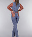 Dieser Zweiteiler ist aus einem Denim-Stretch-Stoff in Kombination mit Kunstleder gefertigt. Er hat ein langärmeliges Oberteil und ist mit einem umklappbaren Kragen ausgestattet. Die Ärmel sind aus einem braunen Stoff in Lederoptik mit dehnbarem Rippstoff mit schwarzen Streifen an den Enden. Das Oberteil hat einen Knopfverschluss, der aus fünf Knöpfen besteht. Auf der Brust hat das Oberteil Brusttaschen. Die Hose ist tailliert und hat ausgestellte Beine. Der Bund hat ein einzigartiges Design, das wie ein offener, gefalteter Kragen aussieht, wie beim Oberteil. Das Set wird mit einem passenden braunen Gürtel in Lederoptik geliefert, den Sie dazu tragen können. Natürlich können Sie auch Ihren eigenen Gürtel verwenden.